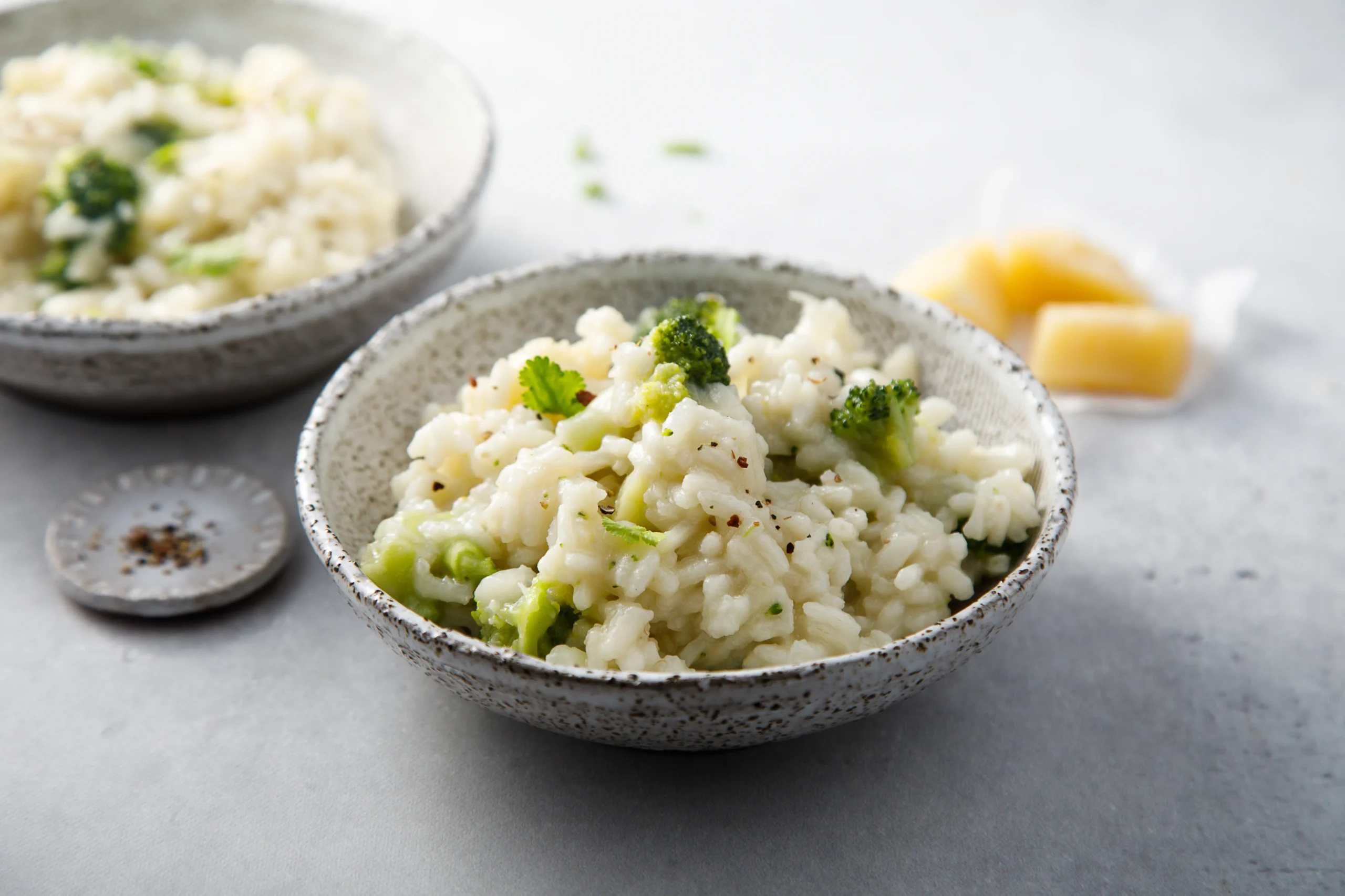 - Repeat this process twice more, stirring constantly. Stirring in broth should take 15 to 20 minutes in all. Stir in cream and cook 5 minutes before stirring in broccoli, chives, Parmesan cheese, and Asiago cheese. Cook and stir until risotto is hot; season to taste with salt and pepper before serving.